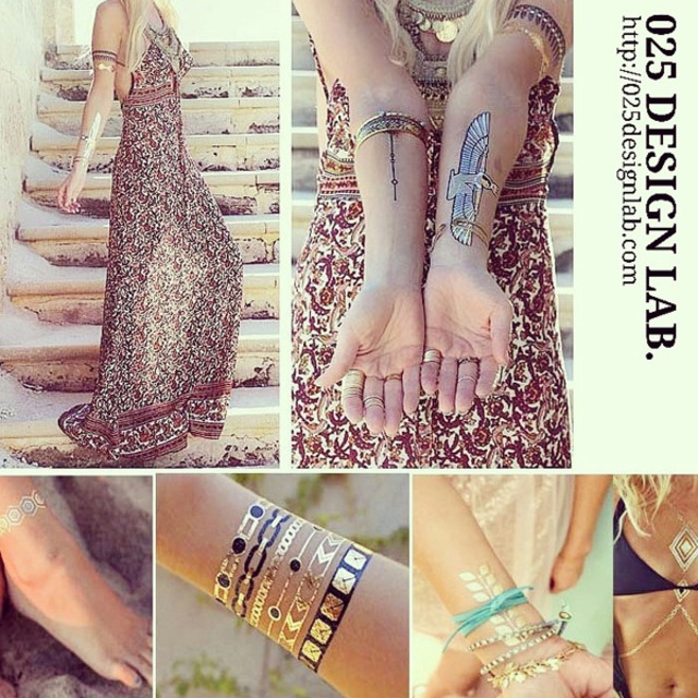 日差しに映え、輝くタトゥーシールが入荷しました。 海はもちろん、フェス、イベント、ライブなどにもオススメのアイテムです。 肌に煌めく金銀の輝きをぜひ楽しんでください。 【シートサイズ】約14.5×19.7cm 【パッケージサイズ】約15.5×27cm 【生産】中国製 【商品番号】TA-0001~TA-0014 ★TA-0004、TA-0006、TA-0008、TA-0011、TA-0012は完売です。 ※1シート500円(SALE47%OFF)です。 ※ハンドメイド品ではありません。仕入品(新品)です。 ※入金確認後即日~3日以内に発送。 【着用時に必要なもの】 ・ハサミ ・水を含ませたコットンやタオル等 【使用方法】 ご使用の前に、貼り付けるお肌の部分を清潔にし、完全に乾かしてください。 1.使いたい部分をハサミででカットします。(透明フィルムは剥がしません) 2.カットしたシートの透明保護フィルムを丁寧に剥がします。 3.清潔にした乾いた肌に、タトゥの柄面を載せます。 4.水を含ませたコットンやタオルを使い、台紙全体ごと十分に湿らせます。 5.十分に湿ると台紙がするりと外れてきますので、シールが転写されていることを確認しながら、ゆっくりと剥がします。 6.そのまましっかり乾燥させるとキレイに仕上がります。 ※落とすときは、クレンジングオイルやベビーオイルを肌になじませ、やさしく落としてください。 ※使用箇所や扱い方によりますが、5~7日ほどお楽しみいただけます。 【ご注意】 ・お肌の弱い方、アレルギー体質の方、皮膚に異常のある時は使用しないでください。 ・目の周りなど敏感な部分には使用しないでください。 ・お肌に異常が現れた時は使用を中止し、皮膚科専門医などに相談してください。 ・ご自身の責任でのご使用をお願いします。 ・海外製造の商品ですので多少の剥がれ、キズ、汚れがある場合がございます。予めご了承の上ご注文ください。 ・モニターや環境によって、写真の彩度が違って見えます。画像は実際の色味とは若干違って見える場合がございます。ご了承ください。