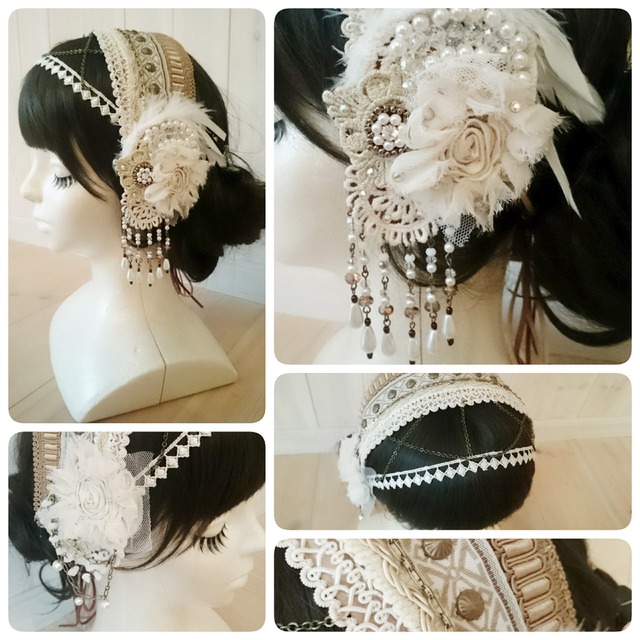 オーダーいただいた「トライバル 風 ヘッドバンド / 額飾り」です。 ご希望の色合い、雰囲気をお伝えいただき、リクエスト個別オーダー品として制作したアイテムです。 トライバル・フュージョンのヘッドバンドとして、女神イメージでオーダーいただいたものです。 エクリュカラーのビシューの輝きがとても綺麗。 ヘッドバンド部分も繊細なイメージで仕上げてあります。 こちらは、皮ひもで結んでいただくタイプとなっております。 踊るときには、ピンなどでしっかり固定して下さると安心です。 お手持ちのアイテムと組み合わせるなど、いろいろと工夫して使っていただけると嬉しいです。 【素材】レース、生地、羽、メタルパーツ、ビジュー、皮ひも、デザインチェーンetc.. 【金具】金古美色