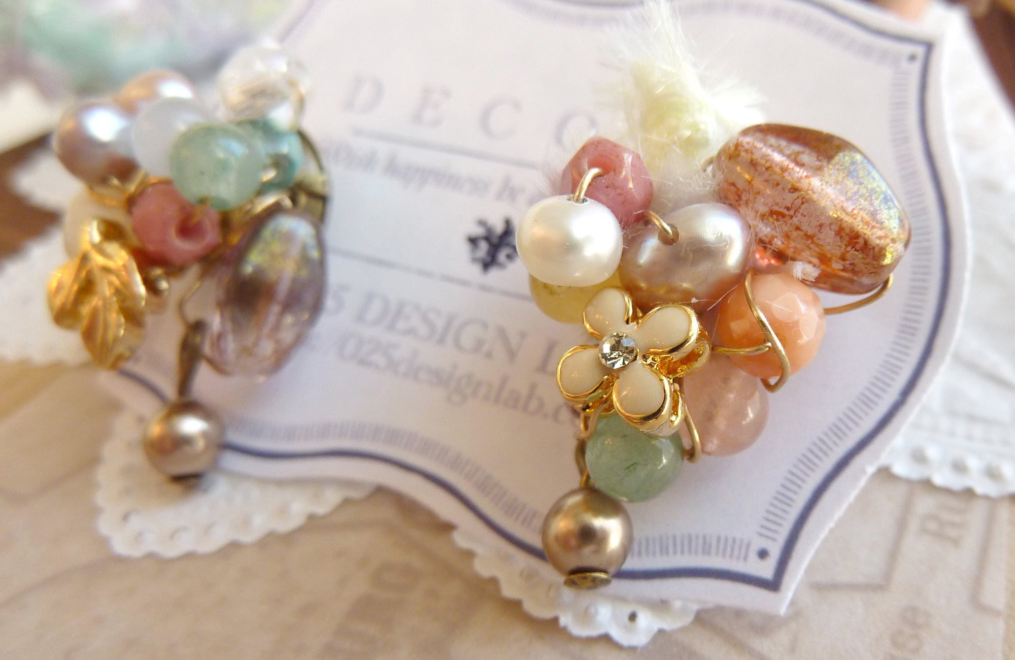お花と葉っぱのチャーム、天然石やビーズパーツをシャワー金具にコラージュした耳飾りです。