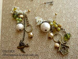 【素材】鳥と巣箱のチャーム、コットンパール、スワロフスキー、チェーン、メタルパーツ、ビーズパーツ、飾り糸etc..
