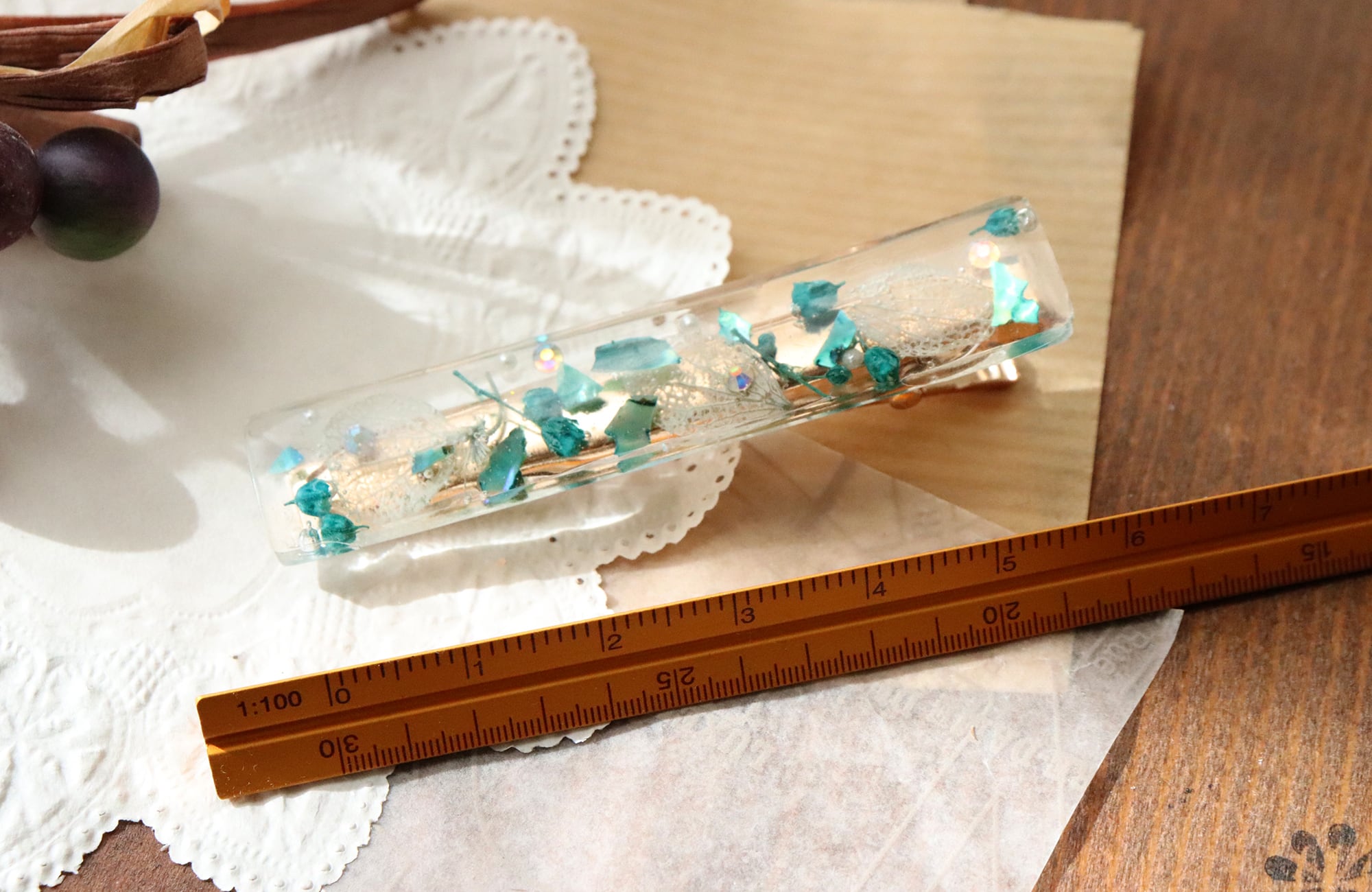 ドライフラワーをレジンで閉じ込めた髪飾りです。