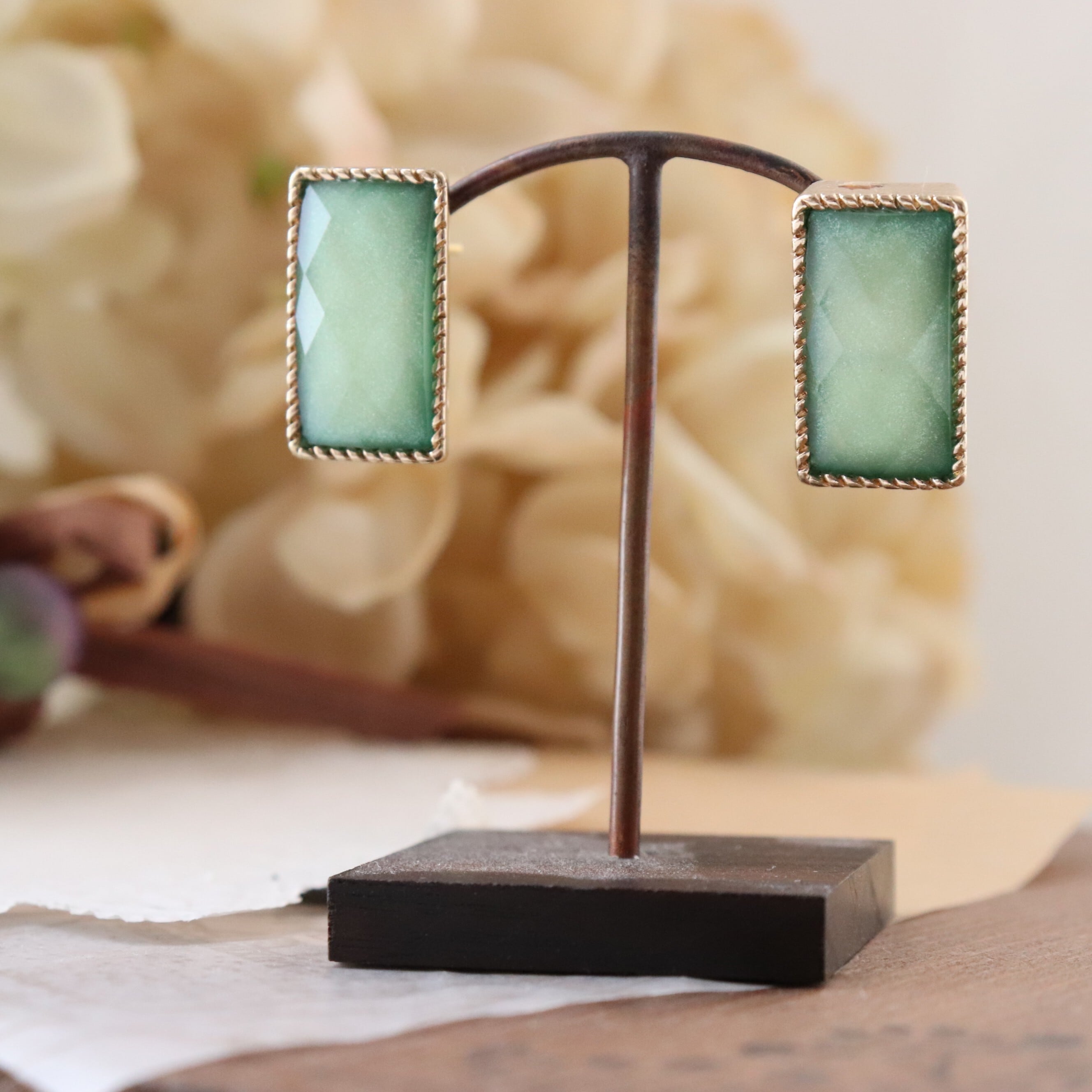 形はスクエア。大人っぽい印象の石ですが、コーディネート次第で可愛い印象にも。