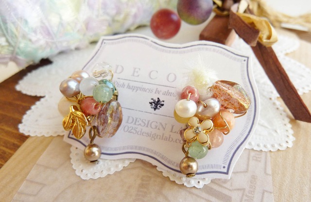 森の風景の優しい色合いをぎゅっと詰め込んだような森のビジューシリーズ新作です。 春らしい色合いの天然石とレースをシャワー金具にコラージュしました。 【サイズ】全体長さ:約2.5cm(ピアス金具除く) 【素材】ローズクォーツ、アゲートソーダライト、シトリン、カルセルトニ、アラゴナイト、淡水パールなどの天然石、レース、ビーズパーツetc.. 【金具】金古美色