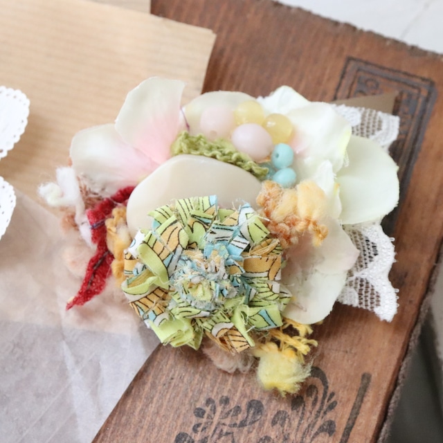 ビジューと布花をコラージュしたブローチ